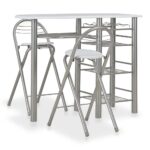 De eethoek is eenvoudig te monteren. De levering bevat 1 tafel met schappen en 2 klapstoelen.