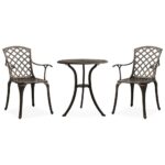De stoelen en de tafel zijn gemaakt van weerbestendig gietaluminium, waardoor je jarenlang plezier hebt van de bistroset. Deze tuinstoelen hebben hoge rugleuningen en zittingen met een hol design. Op de ergonomisch gebogen armleuningen kan je je armen effectief ontspannen. Het stevige tafelblad heeft prachtige patronen en is geschikt voor het plaatsen van drankjes, snacks en andere spullen. Deze tuinset is perfect om aan te eten of te kletsen.