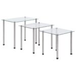 Deze set van 3 tafeltjes is gemaakt van dik gehard glas en roestvrijstalen poten waardoor hij buitengewoon stevig en veilig is. Op het tafelblad kunnen boeken, tijdschriften, fruitmanden en andere kleine spullen die je graag binnen handbereik wilt hebben, geplaatst worden. Het gladde oppervlak is eenvoudig schoon te maken met een vochtige doek. Je kunt de tafels samen of los van elkaar gebruiken en ze in elkaar schuiven om ruimte te besparen wanneer ze niet worden gebruikt.