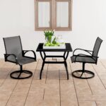 De tuintafel en eetstoel zijn gemaakt van gepoedercoat staal, waardoor ze stevig en stabiel zijn. De ademende textileen stoffen zittingen en rugleuningen zijn ventilerend en sneldrogend. De 360 graden draaibare ronde basis, ergonomische rugleuning en gebogen armleuningen bieden heerlijk zitcomfort.