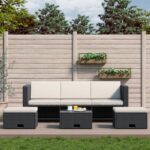Dankzij het weer- en waterbestendige PE rattan is de set eenvoudig schoon te maken, slijtvast en geschikt voor dagelijks gebruik. Het tafelblad van gehard glas kan eenvoudig worden gereinigd met een vochtige doek. De tuinset bestaat uit een stevig, gepoedercoat stalen frame dat zeer duurzaam is. Hij is ook erg licht, waardoor de modulaire set eenvoudig kan worden verplaatst. De dikke, afneembare stoel- en bankkussens zijn erg comfortabel en kunnen worden gewassen. Daarnaast hebben de tafel en de hockers voldoende opbergruimte om tijdschriften en andere spulletjes binnen handbereik op te bergen. De tafel en hockers passen netjes onder de bank en kunnen eenvoudig worden uitgetrokken en terug worden geschoven wanneer ze niet worden gebruikt.