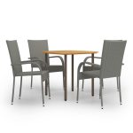 De eettafel is gemaakt van massief acaciahout en duurzaam staal, waardoor hij stevig en stabiel is. Het geoliede oppervlak maakt het meubel geschikt voor buitengebruik. De eetstoelen hebben een stalen frame bedekt met weerbestendig PE-rattan, waardoor ze stevig en eenvoudig te reinigen zijn. Deze tuinstoelen kunnen gestapeld worden om ruimte te besparen wanneer ze niet gebruikt worden.
