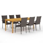 De eettafel is gemaakt van massief acaciahout met een olieafwerking, waardoor hij stabiel, duurzaam en gemakkelijk te onderhouden is. De eetstoelen hebben een gepoedercoat stalen frame bedekt met weerbestendig PE-rattan waardoor ze stevig en gemakkelijk schoon te maken zijn. De buitenstoelen zijn lichtgewicht en kunnen gestapeld worden om ruimte te besparen.