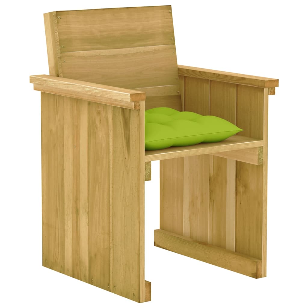 De tafel en stoelen hebben een elegant en tijdloos design en zijn gemaakt van geïmpregneerd grenenhout, waardoor ze duurzaam en weerbestendig zijn. Zet de set in de tuin of op je terras en geniet van je vrije tijd met een boek en een heerlijk kopje koffie De kussens zijn gemaakt van 100% polyester, dat sterk en duurzaam is. Ze zijn geschikt voor zowel binnen- als buitengebruik en bieden een ultrazachte en langdurige zitervaring. De hoogwaardige stiksels aan de randen van het kussen zijn duurzaam en de touwtjes zorgen voor stevige bevestiging aan de zitting.