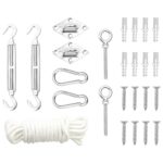 De roestvrijstalen bevestigingsset is eenvoudig in gebruik en perfect voor de meeste soorten zonneschermen. Zodra de hijsogen aan een stabiele muur zijn bevestigd, kan het zonnescherm met de karabijnhaken worden vastgeklikt. Ze zijn ook heel gemakkelijk te verwijderen. Bovendien is de spanschroef verstelbaar, waardoor het zonnescherm eenvoudig kan worden vast- of losgedraaid.