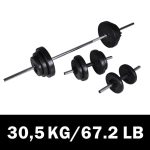 Deze barbell-/dumbbellset zorgt ervoor dat je kan trainen in je eigen huis. De set weegt in totaal 30,5 kg en bestaat uit 12 gewichtsschijven van 1,25, 2,5 en 5 kg.