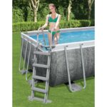 De Bestway Flowclear zwembadladder, ontworpen voor bovengrondse zwembaden, zorgt ervoor dat gebruikers het zwembad makkelijk en veilig kunnen betreden en verlaten.