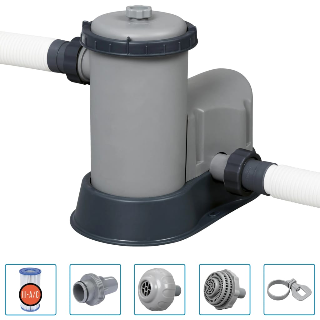 De filterpomp is een onderdeel van het circulatiesysteem om het water schoon te houden. Het filterpatroon helpt voorkomen dat algen, schimmels en andere microbiële bacteriën in je zwembad groeien. De ChemConnect dispenser onderhoudt en zorgt voor schoon en gezond zwembadwater. De zwembadladder helpt je om veilig in en uit het zwembad te stappen. De treden aan de ene kant van de ladder kunnen naar de bovenkant worden verplaatst, wat helpt voorkomen dat kleine kinderen op de ladder klimmen om het zwembad te betreden. Het zwembad is gemakkelijk op te vouwen voor opslag en transport wanneer het niet wordt gebruikt.