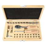 Met de fijngetande ratelsleutel kun je de doppen goed vastzetten en snel verwisselen. De handvatten van het gereedschap zijn gemaakt van natuurlijk beukenhout, waarbij rekening is gehouden met alle veiligheidsgerelateerde en ergonomische aspecten. De dopsleutels zijn gemaakt van hoogwaardig chroom-vanadiumstaal en zijn dus roestbestendig. Ook liggen ze perfect in de hand en zijn ze sterk en duurzaam. De inbegrepen koffer is voorzien van uitsparingen, zodat elk stuk gereedschap zijn eigen plaats heeft. De doppenset is ideaal voor werkzaamheden aan auto’s, motorfietsen, fietsen en alle montagewerkzaamheden in huis of in de werkplaats.