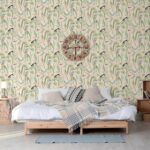 Het duurzame behang heeft een kleurrijk ontwerp met bladeren en flamingos in crème en mintgroen. Het kan droog worden verwijderd zonder je muur te beschadigen.