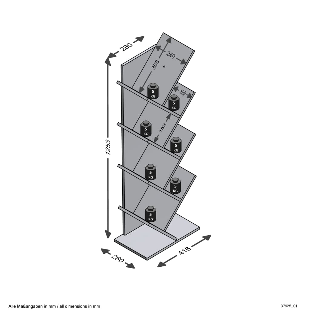 Vul de “takken” van de boom met je favoriete boeken om een opvallend decoratief schap te creëren. Dit staande schap is een modern wandrek met 4 en respectievelijk 5 vakken aan elke kant, die zijn gerangschikt in een speels, schuin patroon.