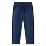Deze kinderbroek heeft zwarte biezen, 4 zakken en een elastische tailleband met een trekkoord. Deze kinderbroek heeft rechte pijpen voor een comfortabele draagervaring. De marineblauwe kinderbroek is gemaakt van 65% viscose, 30% polyamide en 5% elastaan waardoor hij comfortabel, ademend en duurzaam is.