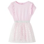 Dit kinderjurkje heeft korte mouwen, een ronde halslijn en een knoopsluiting in de nek. Dit lichtroze kinderjurkje heeft leuke ruches die vanaf de voorkant langs de mouwinzet lopen. Deze jurk heeft een zwierige tule rok met glanzende hartenprint. Hij is gemaakt van zacht materiaal, waaronder katoen, elastaan en polyester, voor comfort en ademend vermogen.