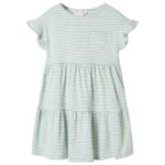 Deze kinderjurk heeft een ronde halslijn, mouwen met ruches en 1 zakje op de borst. Deze mintkleurig kinderjurk heeft een patroon van strepen. Het korte kinderjurkje is gemaakt van zacht materiaal met katoen en elastaan, waardoor het comfortabel en ademend is.