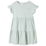 Deze kinderjurk heeft een ronde halslijn, mouwen met ruches en 1 zakje op de borst. Deze mintkleurig kinderjurk heeft een patroon van strepen. Het korte kinderjurkje is gemaakt van zacht materiaal met katoen en elastaan, waardoor het comfortabel en ademend is.