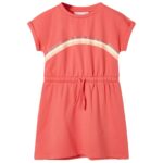Deze kinderjurk heeft een ronde halslijn, kapmouwen en een elastische tailleband met een verstelbaar trekkoord. Op de kinderjurk staan 3 gekleurde, gebogen strepen afgebeeld. Het korte kinderjurkje is gemaakt van zacht materiaal met 95% katoen en 5% elastaan, waardoor het comfortabel en ademend is.