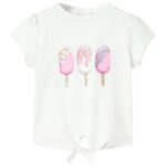 Dit kindershirt heeft korte mouwen, een ronde halslijn en een recht model. Op dit kindershirt staan ijsjes afgebeeld Het kindershirt met korte mouwen is gemaakt van 95% katoen en 5% elastaan, waardoor het zacht en comfortabel aanvoelt.