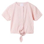 Dit kindershirt heeft korte mouwen, een ronde halslijn en een recht model. Deze kinderblouse heeft een ruitjespatroon. Het kindershirt met korte mouwen is gemaakt van 50% rayon en 50% polyester, waardoor het zacht en comfortabel aanvoelt.
