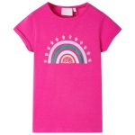 Dit kindershirt heeft korte mouwen met ingenaaide omslagen, een ronde halslijn en een recht model. Op dit kindershirt staat een glimmende regenboog afgebeeld met langs de buitenste rand allemaal aardbeien. Het kindershirt met korte mouwen is gemaakt van 95% katoen en 5% elastaan, waardoor hij comfortabel en ademend is.