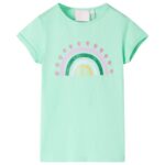 Dit kindershirt heeft korte mouwen met ingenaaide omslagen, een ronde halslijn en een recht model. Op dit kindershirt staat een glimmende regenboog afgebeeld met langs de buitenste rand allemaal aardbeien. Het kindershirt met korte mouwen is gemaakt van 95% katoen en 5% elastaan, waardoor hij comfortabel en ademend is.