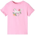 Dit kindershirt heeft korte mouwen met ruches, een ronde halslijn en een recht model. Op dit kindershirt staat een mooie eenhoorn met bladeren en bloemen afgebeeld. Het kindershirt met korte mouwen is gemaakt van zacht materiaal met 95% katoen en 5% elastaan, waardoor het comfortabel en ademend is.