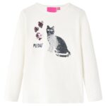 Dit kindershirt heeft lange mouwen, een ronde halslijn en een recht model. Dit ecru t-shirt heeft een glinsterende kat van pailletten en is versierd met hartjes met pailletten. Het kindershirt met lange mouwen is gemaakt van zacht materiaal met 95% katoen en 5% elastaan voor extra comfort en ademend vermogen.