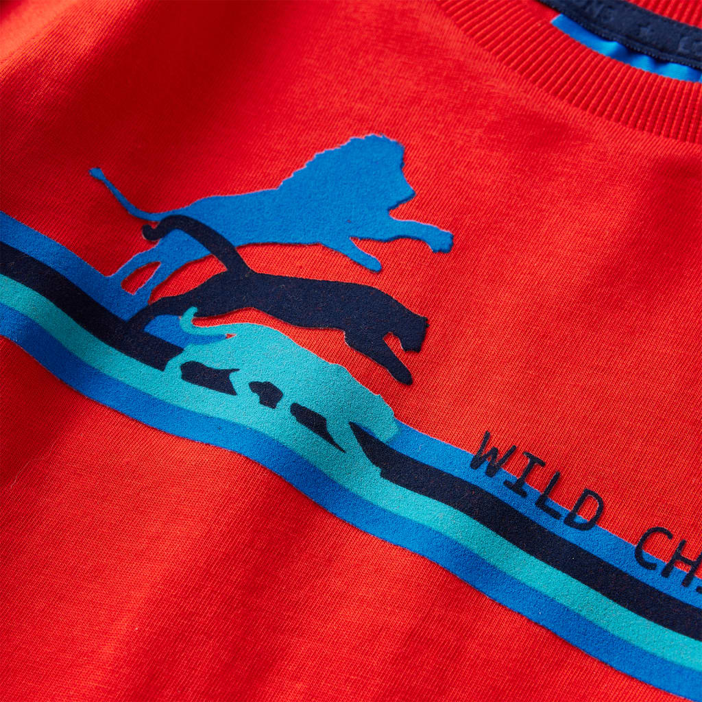Dit t-shirt heeft lange mouwen, een ronde halslijn en een recht model. Op dit rode kindershirt staan wilde dieren afgebeeld. Het kindershirt met lange mouwen is gemaakt van 100% katoen en voelt zacht en comfortabel aan.