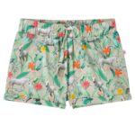Deze korte broek voor kinderen heeft een elastische tailleband met trekkoord, een nepachterzak en ingenaaide omslagen aan de zoom. Deze kindershorts zijn met eenhoorns en planten bedrukt. De kindershort is van zacht materiaal gemaakt met onder andere 94% katoen en 6 % elastaan voor comfort en ademend vermogen.