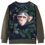 Deze trui voor kinderen heeft lange mouwen, een ronde hals en geribbelde randen aan de manchetten, halslijn en onderkant. Op deze kindertrui staat een aap afgebeeld met bladeren om hem heen. De kindertrui is gemaakt van 92% katoen en 8% polyester, waardoor hij zacht en comfortabel is. De zachte fleecevoering van de kindertrui zorgt voor extra warmte.