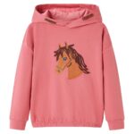 Deze kindertrui met capuchon heeft lange mouwen en een elastische zoom. Op de trui staat een paard afgebeeld. Deze kinderhoodie is gemaakt van katoen en elastaan, waardoor hij zacht en comfortabel aanvoelt.
