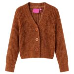 Dit kindervest heeft lange mouwen en een lage V-hals en sluit met een rij knopen. Dit kindervest is gebreid van zacht materiaal met 17% acryl, 63% polyester, 3% elastaan, 11% wol en 6% alpacawol, wat voor extra warmte en comfort zorgt. Het korte vest heeft geribbelde randen aan de zoom en mouwen.