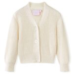 Dit kindervest heeft lange mouwen en een lage V-hals en sluit met een rij knopen. Dit kindervest is gebreid van zacht materiaal van 100% katoen, wat voor extra warmte en comfort zorgt. Het korte vest van 100% katoen heeft geribbelde randen aan de zoom en mouwen.