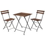 De set bestaat uit 1 tafel en 2 stoelen. Hij is de perfecte eetset voor kleine flats of plaatsen waar de ruimte beperkt is. De meubelset is gemaakt van acaciahout met een zwart metalen frame. Dankzij het inklapbare ontwerp is de loungeset een echte ruimtebespaarder wanneer je hem niet gebruikt.