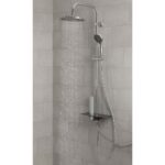 Dit douchesysteem is gemaakt van metaal en heeft een lange levensduur. Het unieke ontwerp van de douchekop en de extra grote maat zorgen voor een geweldige douche-ervaring. De handdouche met 5 functies heeft een drukknop met omschakeling voor eenvoudig wisselen tussen hoofddouche en handdouche. De flexibele metalen doucheslang van 150 cm biedt excellente mobiliteit voor verschillende badkamergroottes. Het plateau is handig voor het plaatsen van je douchespullen.