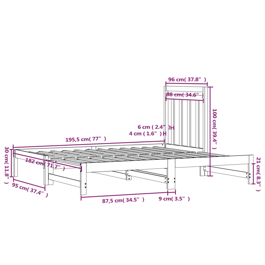 Afmetingen slaapbank (niet uitgeschoven): 195,5 x 95 x 30 cm (L x B x H)