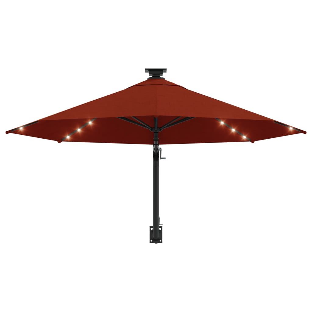 Het parasoldoek is gemaakt van uv-beschermend en anti-vervagend polyester waardoor het je optimale bescherming tegen de zon biedt en het gemakkelijk schoon te maken is. Het exclusieve ontwerp van deze parasol stelt je in staat om de parasol te kantelen om zo de zon te blokkeren terwijl deze langzaam richting de horizon beweegt. De sterke metalen paal, samen met de 8 duurzame baleinen, maakt de wandparasol zeer stabiel en duurzaam. De tuinparasol kan eenvoudig geopend en gesloten worden dankzij het zwengelmechanisme. De geรฏntegreerde 28 LED-lampjes zorgen ‘s avonds voor een gezellige en romantische sfeer.